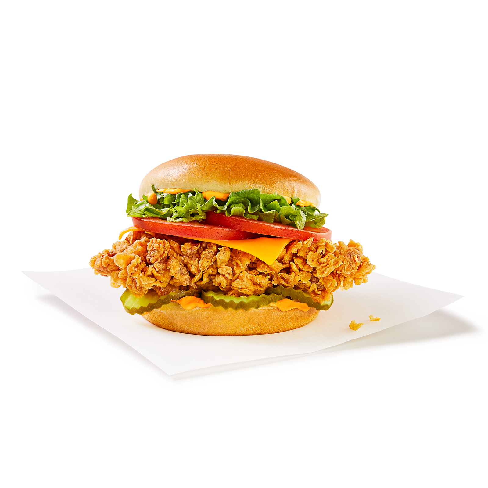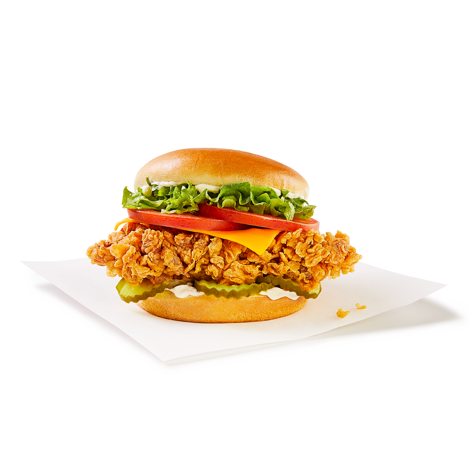 Enjoy our famous triple-breaded chicken fillet, topped with cheddar cheese, fresh lettuce, tomatoes, and crispy pickles, all served on a warm potato bun with creamy mayo. This Box Meal also includes individual Popcorn Chicken, individual fries, an individual side of your choice, a drink and a dip.